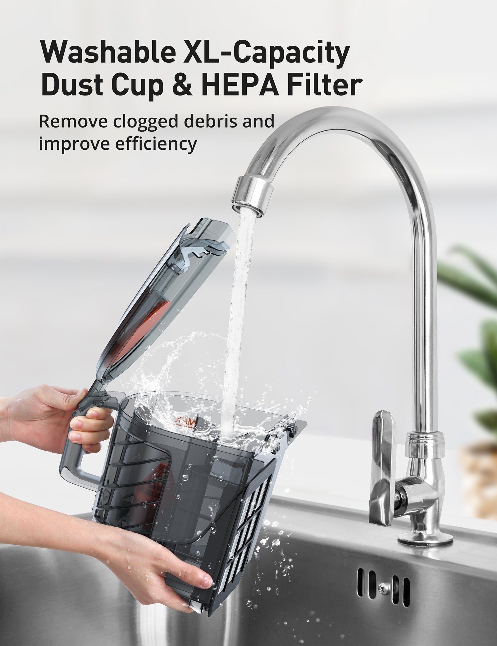 XL Capacity Dust Cup: Don't need dust bags thanks to the bagless and washable design; 3.7QT large dust cup reduces how often you must empty it and improves cleaning efficiency compared to standard 2QT small-capacity dust cups