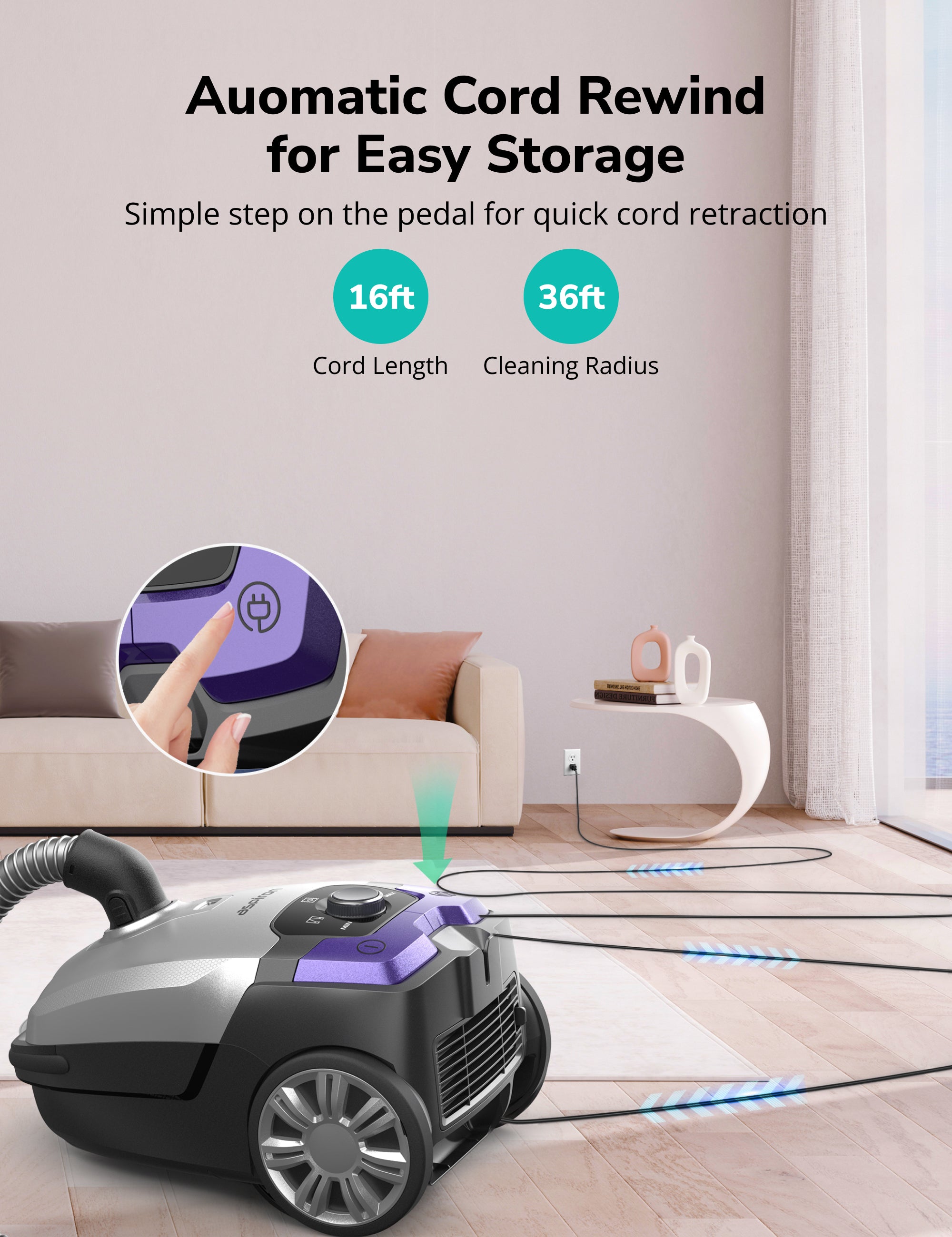- ๐๐ฑ๐ญ๐๐ง๐๐๐ ๐๐ฅ๐๐๐ง๐ข๐ง๐ ๐๐๐๐๐ก ๐ฐ๐ข๐ญ๐ก ๐๐ฎ๐ญ๐จ ๐๐จ๐ซ๐ ๐๐๐ฐ๐ข๐ง๐๏ผThe combination of 5m cord, 1.5m hose and 1m telescopic wand extends the cleaning radius to high spots like curtain tops and under-bed gaps. Just press a button to activate auto cord rewind, retracting the 5m power cord neatly for easy storage.
